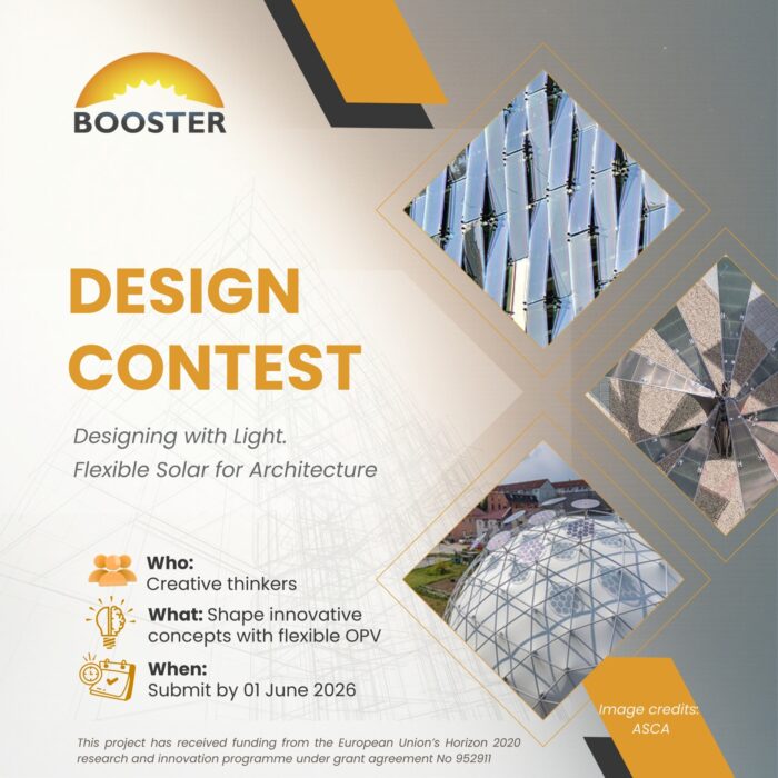 February 19The BOOSTER project has officially opened its Design Contest, inviting creative thinkers based in EU to explore new possibilities for integrating Organic Photovoltaic (OPV) technology into architectural and building-applied concepts. Participants are encouraged to push the boundaries of creativity, using a 5 m² OPV film supplied by ASCA GmbH & Co. KG as the basis for their ideas. The contest focuses on originality and vision rather than technical calculations.